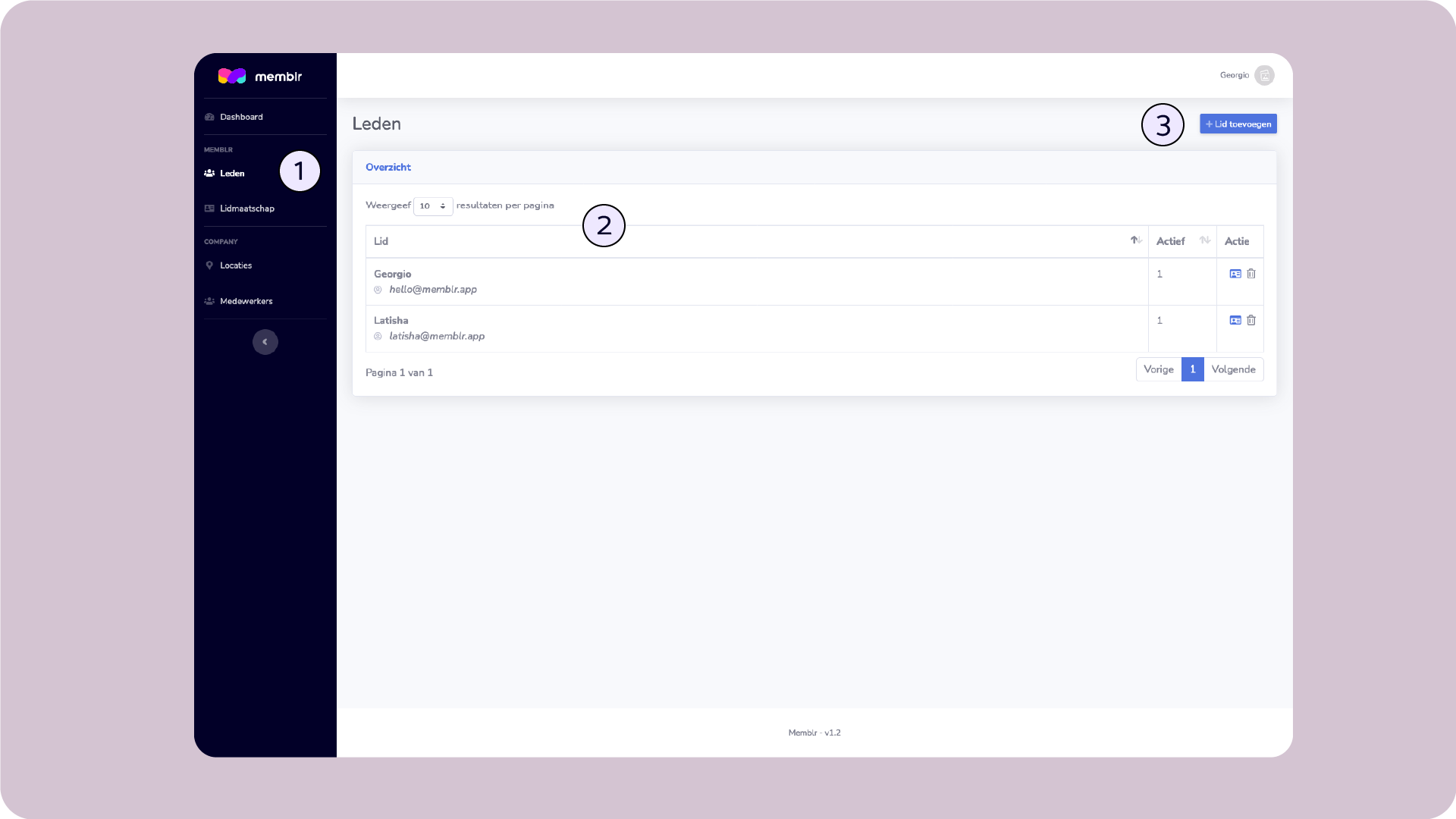 Via ons dashboard kan je de lidmaatschap van jouw klanten beheren, Navigeer links in het dashboard naar "Klanten" (1), vervolgens krijg je een overzicht te zien met alle klanten van jouw bedrijf. Hier kan je jouw leden bewerken (2) of nieuwe leden toevoegen (3).