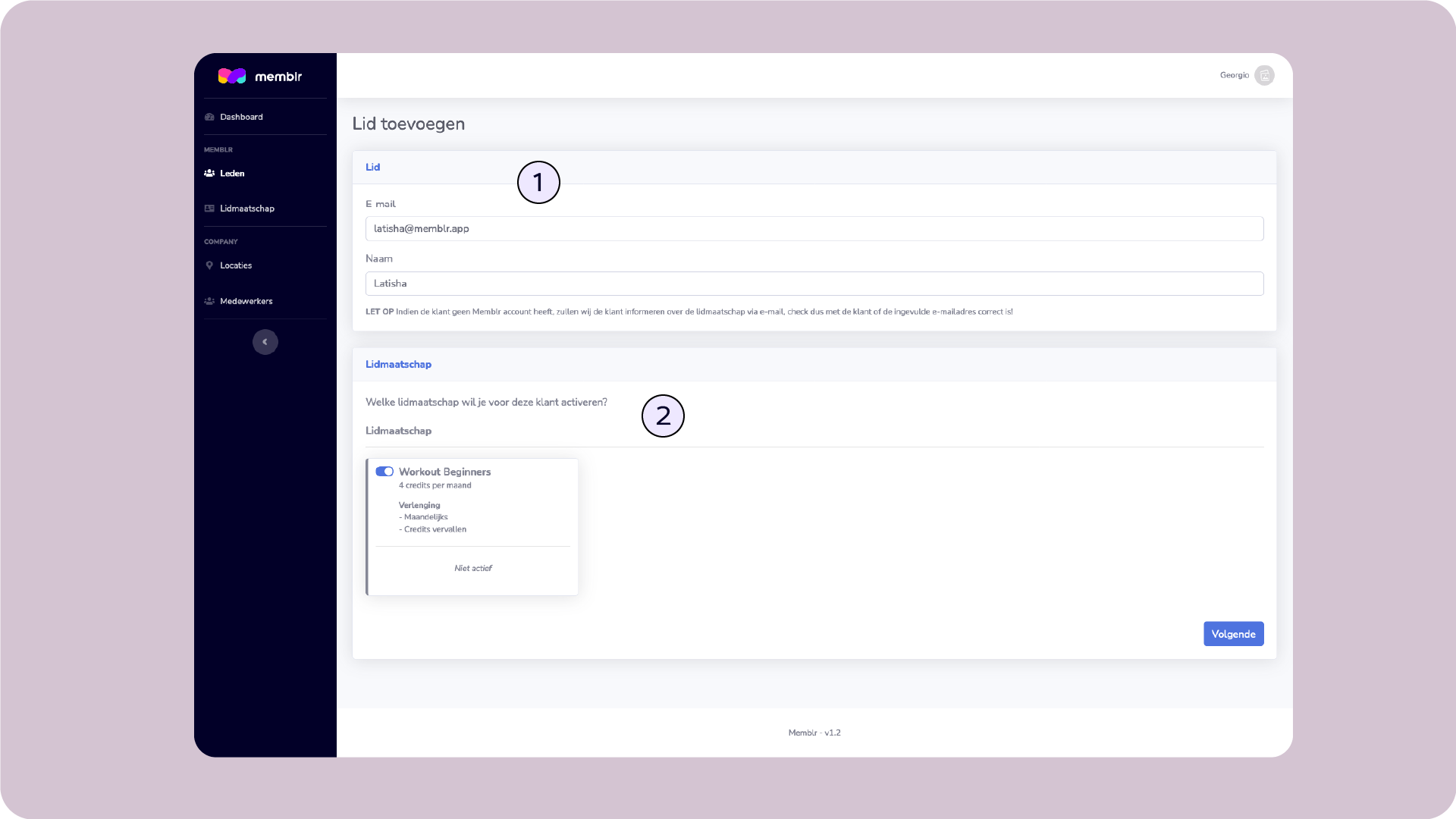 Bij het toevoegen van een klant geef je eerst een naam en e-mailadres op, en bij het bewerken van de klant zijn deze velden al automatisch ingevuld (1). Vervolgens kan je de lidmaatschap beheren (2) en wanneer je de klant bewerkt zie je ook nog de optie om credits te claimen.
